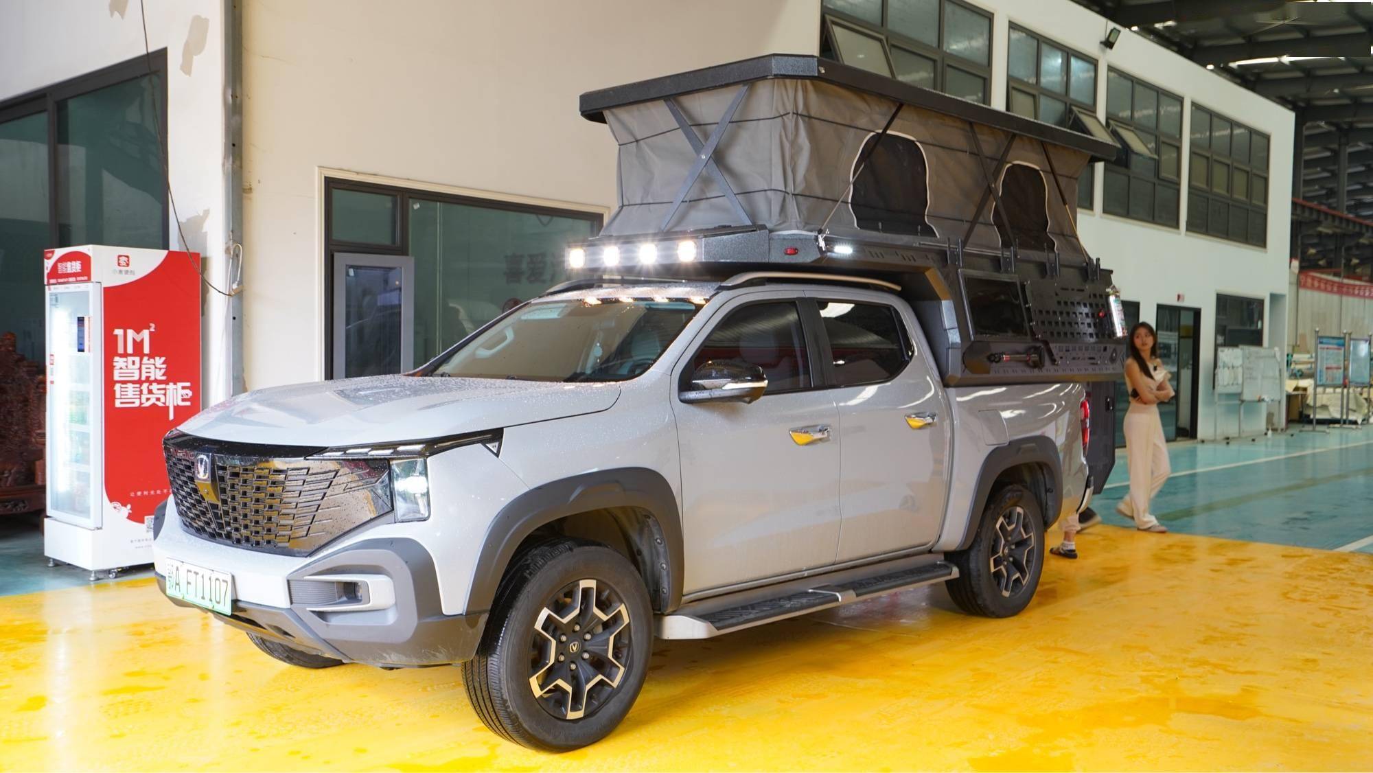 猎手新能源背驼房车基于皮卡底盘打造,公告长度5.4米,高度2.1米,这样的尺寸设计使其能够轻松进出地下车库,完美融入城市生活,摆脱了传统房车在城市中停车难的困扰。车身线条硬朗流畅,搭配银灰色金属漆,质感十足,在阳光下闪耀着迷人的光泽。醒目的亮黄色拉花装饰则为整车增添了一份时尚与活力,无论行驶在城市街道还是郊外公路,都能成为众人瞩目的焦点。