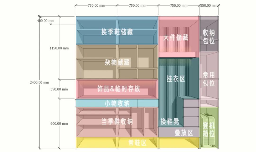 每个区域,在高度上分为常用区和非常用的换季储纳区,一般常用物品安排在中下部位。