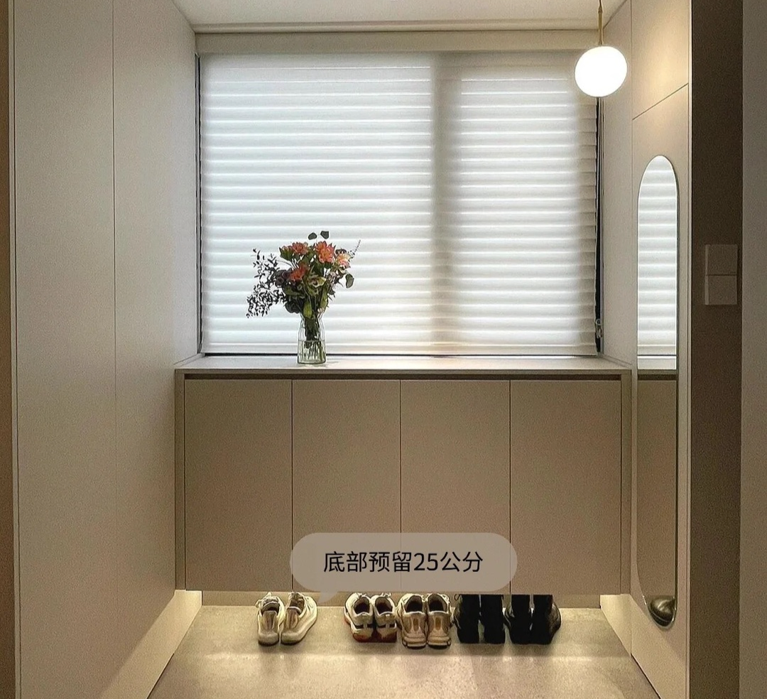 ①在做鞋柜时,下方悬空留空15-25cm,放置常穿鞋子,不用反复开柜门,也更便于清扫;靠门的一侧可以预留空位,安装换鞋凳、镜子、挂钩,使用方便;